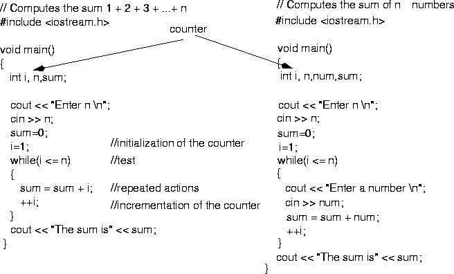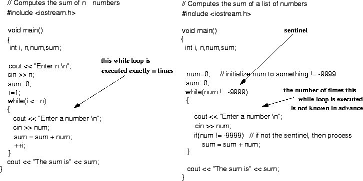 - Event-Controlled loop: it is executed a number of times which is not known in advance (everything depends on what is happening in the body of the while loop)