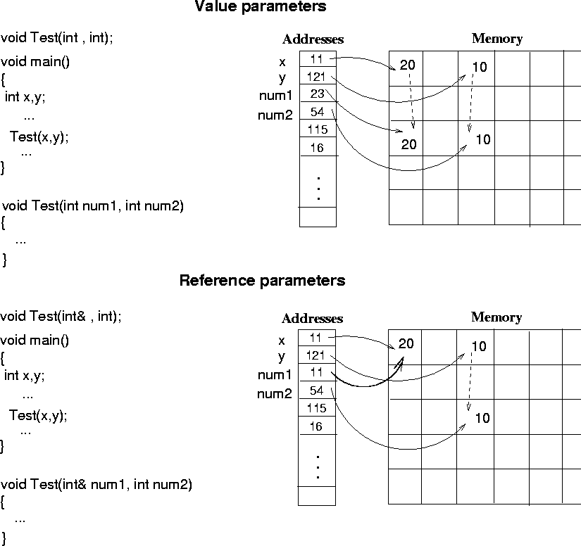 - Reference parameters: the function receives a copy of the address of the actual parameter (pass by reference)